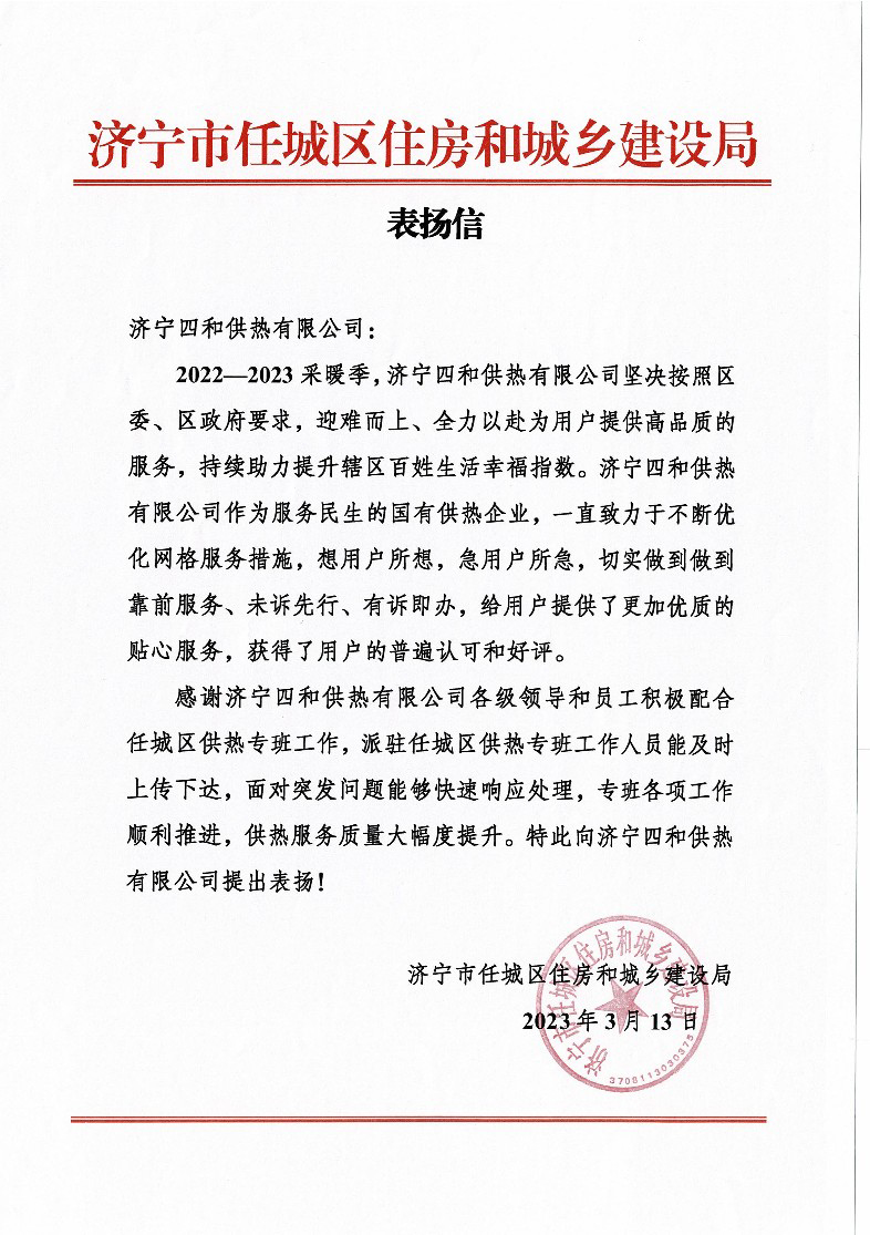 近日,濟(jì)寧市任城區(qū)住房和城鄉(xiāng)建設(shè)局向濟(jì)寧四和供熱有限公司發(fā)來表揚(yáng)信,對(duì)公司積極響應(yīng)區(qū)委、區(qū)政府的號(hào)召,勇于承擔(dān)保障供熱、服務(wù)民生的社會(huì)責(zé)任,千方百計(jì)克服困難,全力以赴提高供熱服務(wù)質(zhì)效,持續(xù)助力提升轄區(qū)百姓生活幸福指數(shù)提出表揚(yáng)。